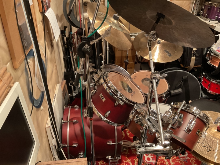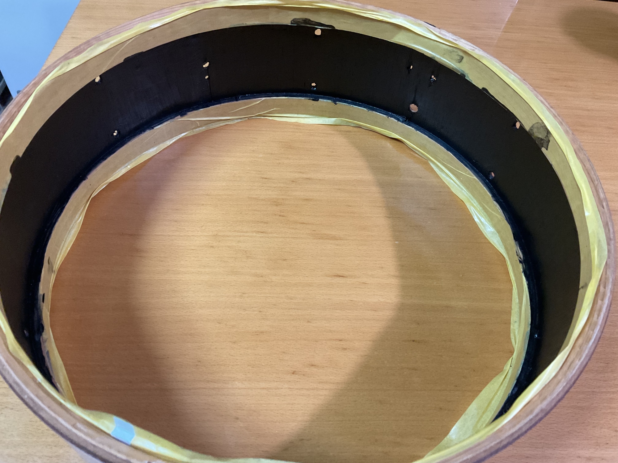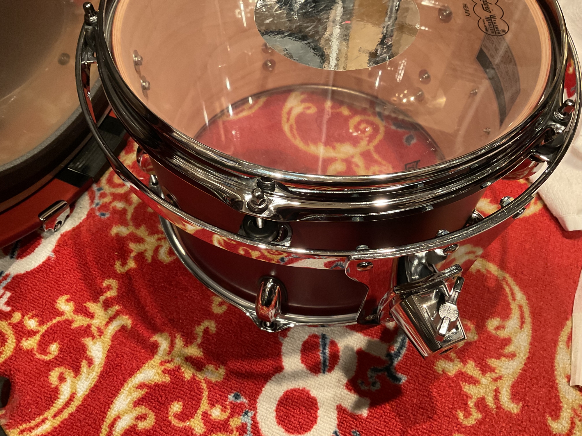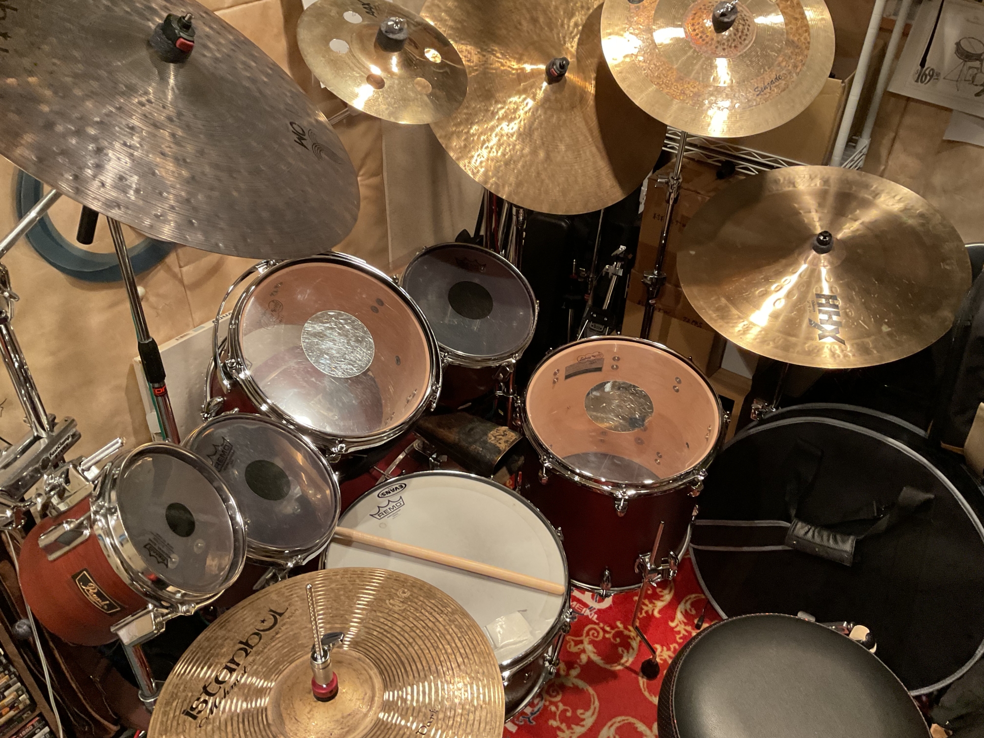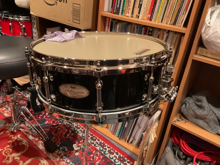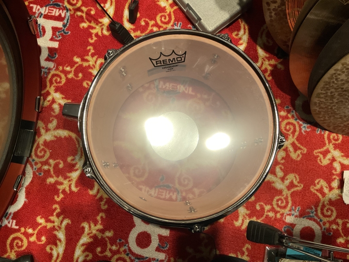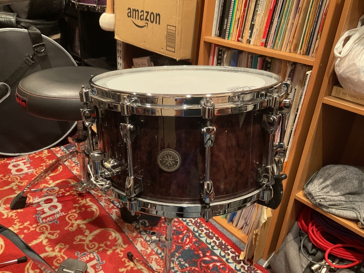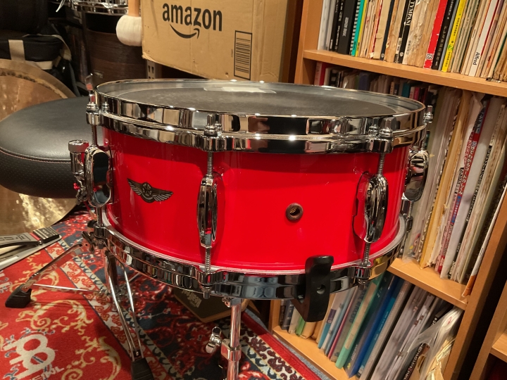先日のメルカリで買ったスネア、使ってますけど木にも金属にも出ない音でとても素晴らしい。