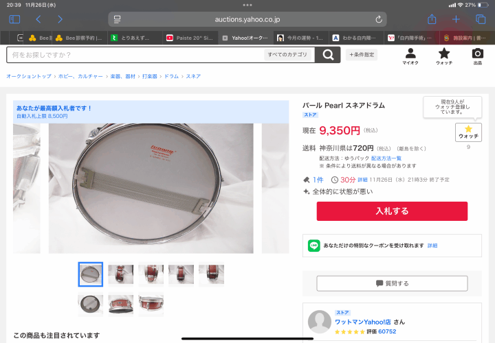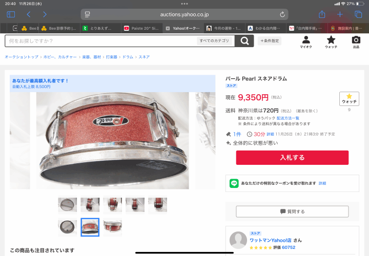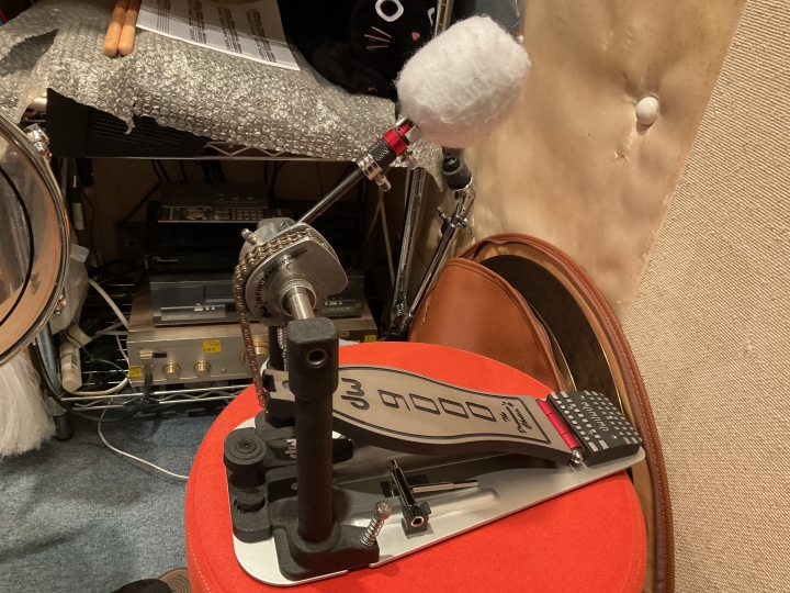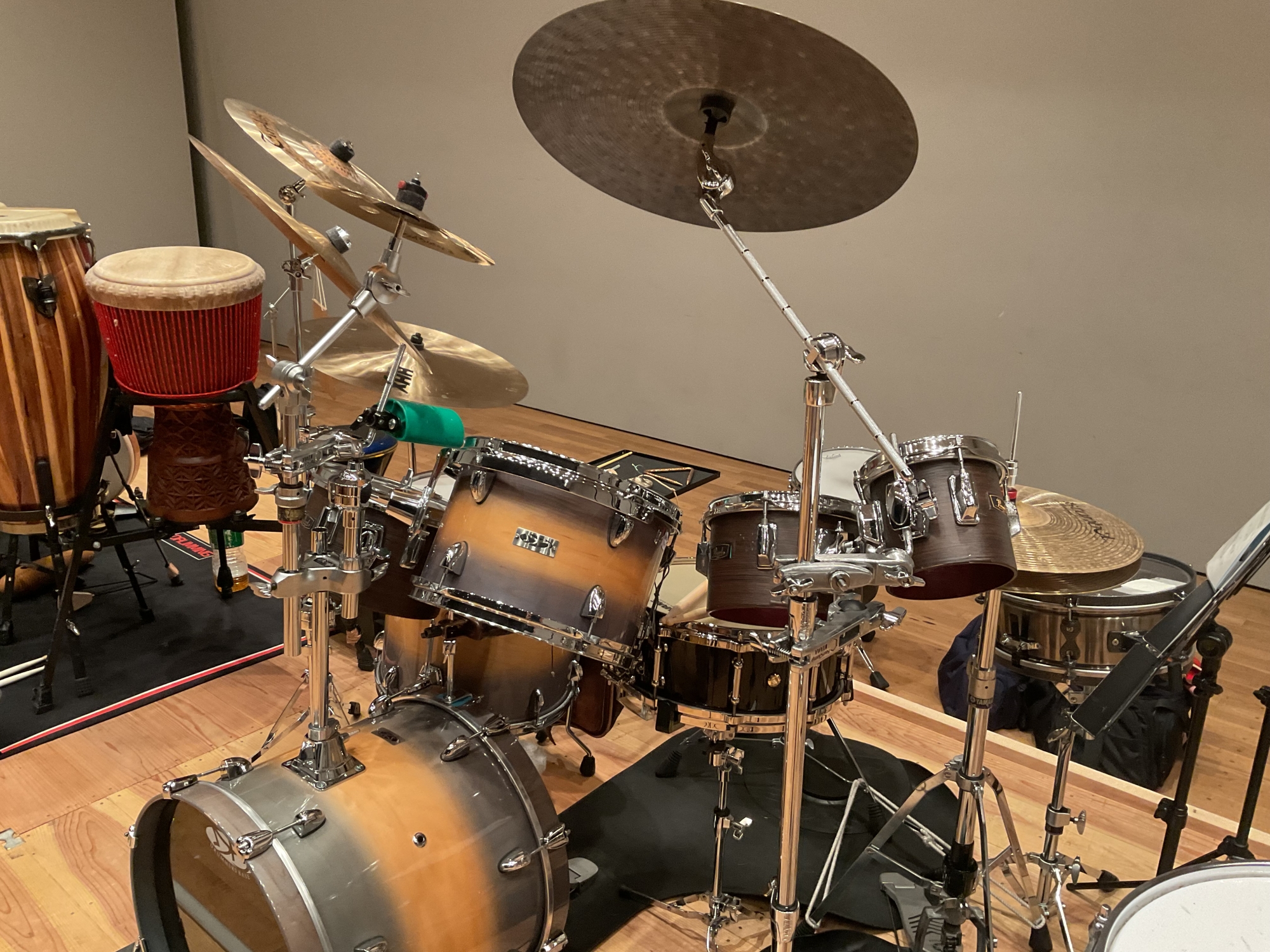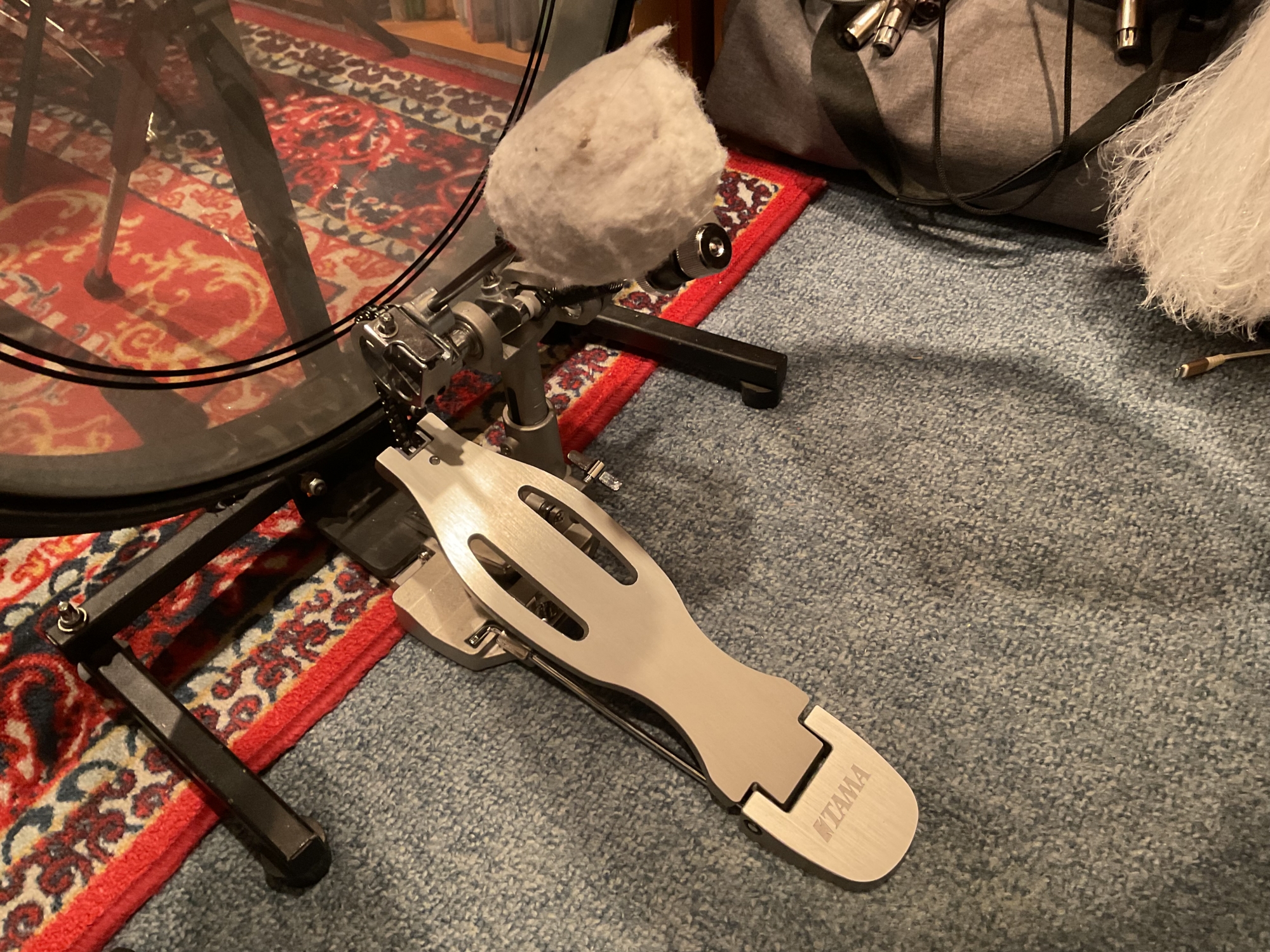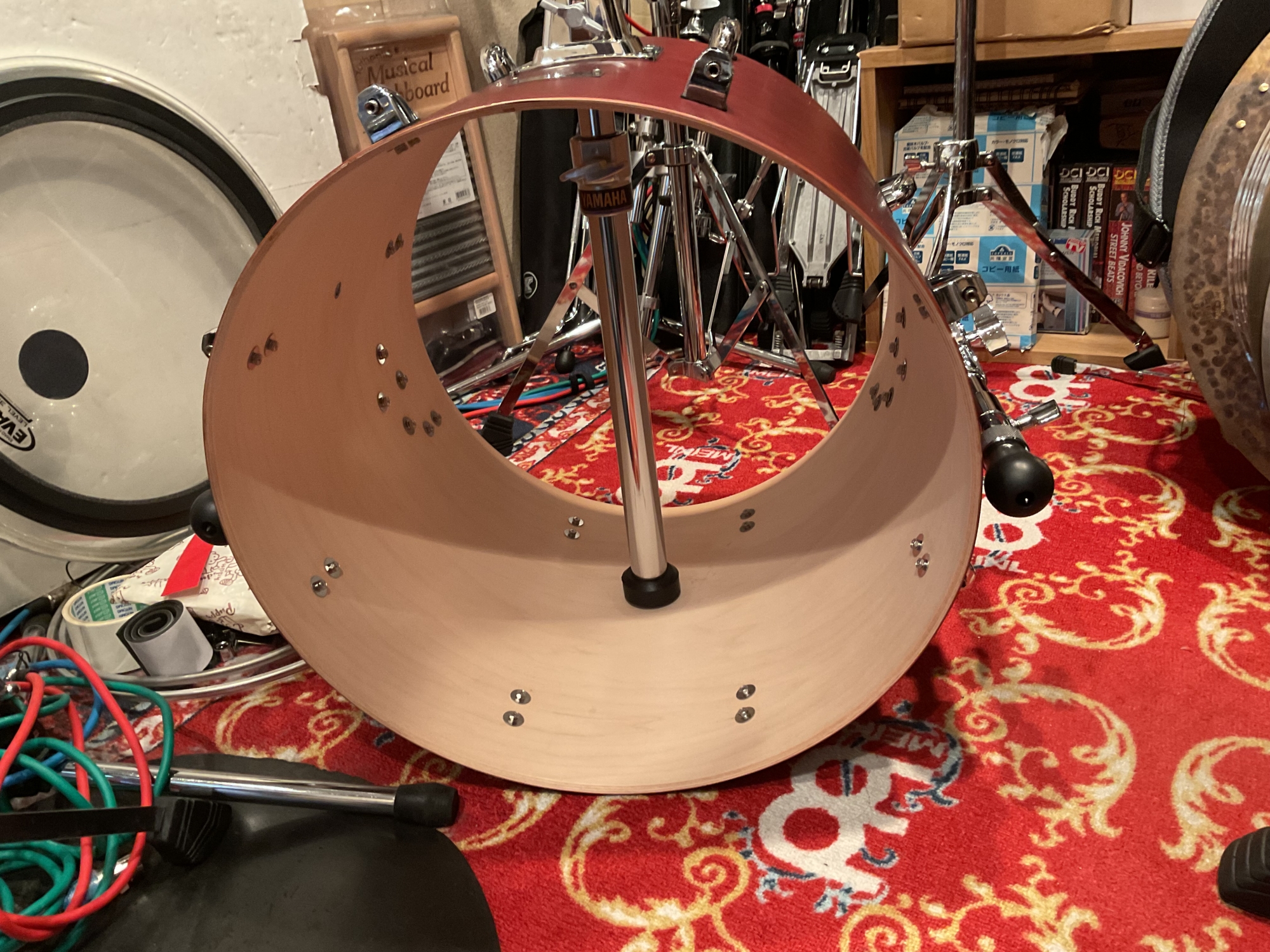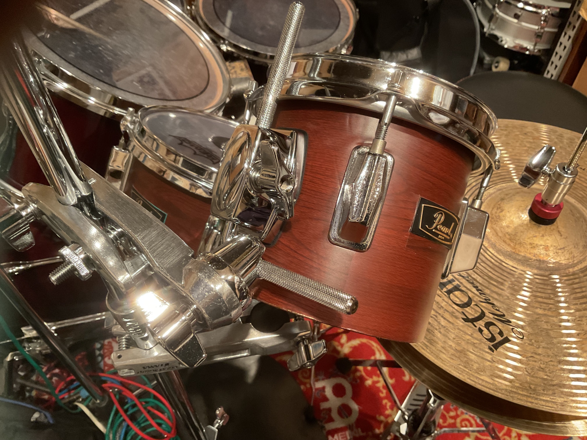 先日のメルカリで買ったスネア、使ってますけど木にも金属にも出ない音でとても素晴らしい。